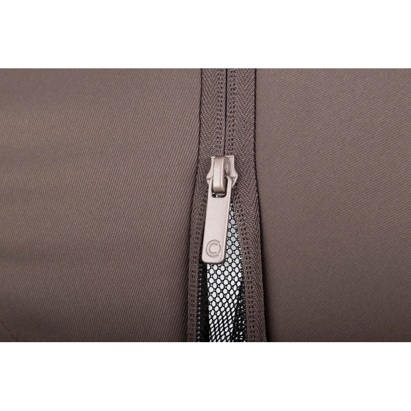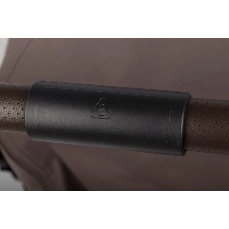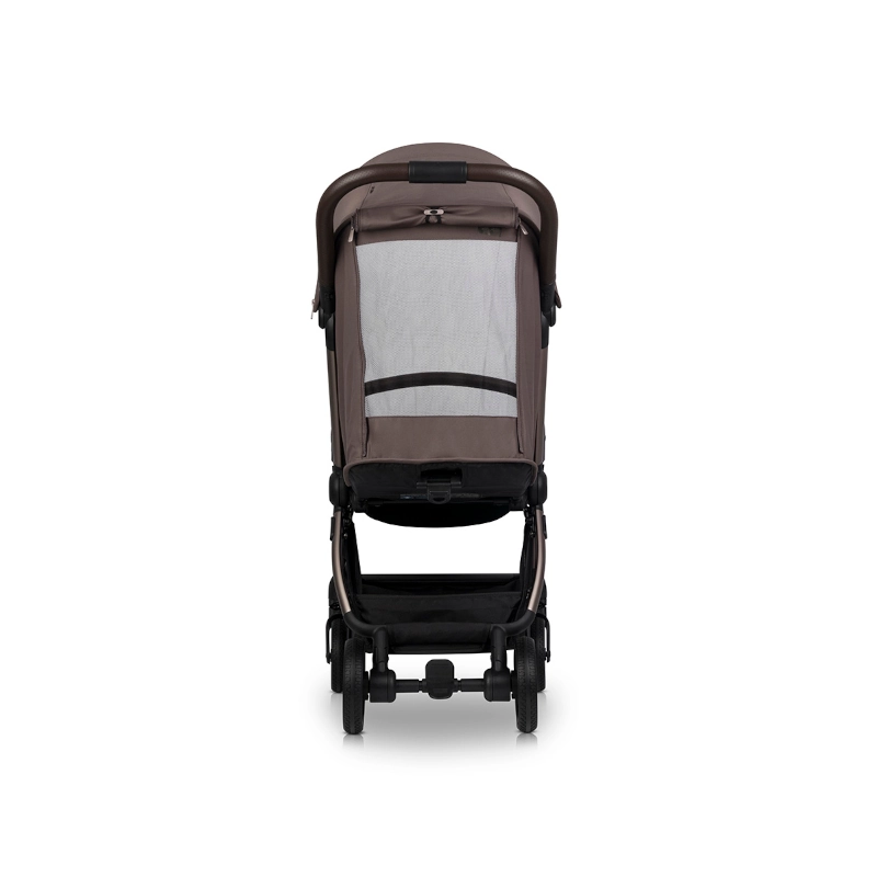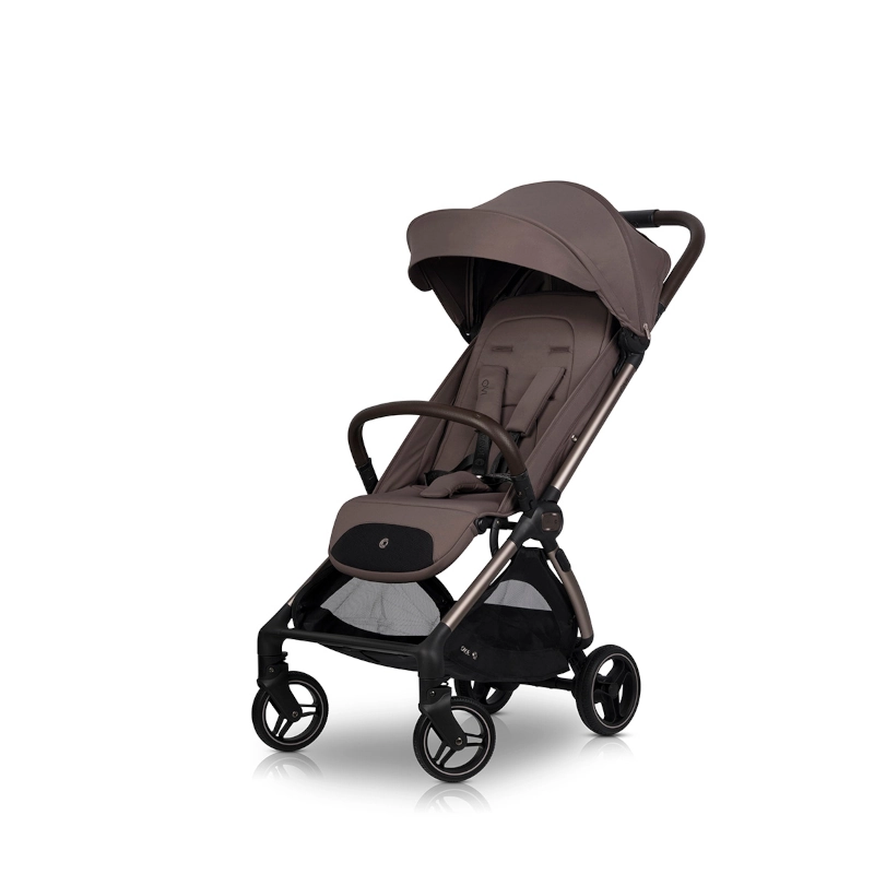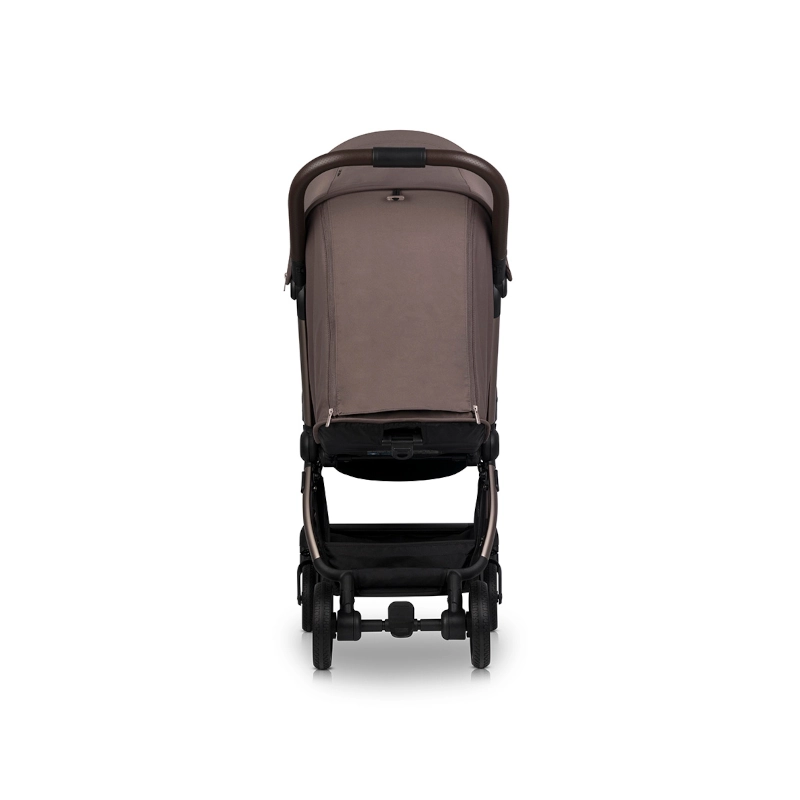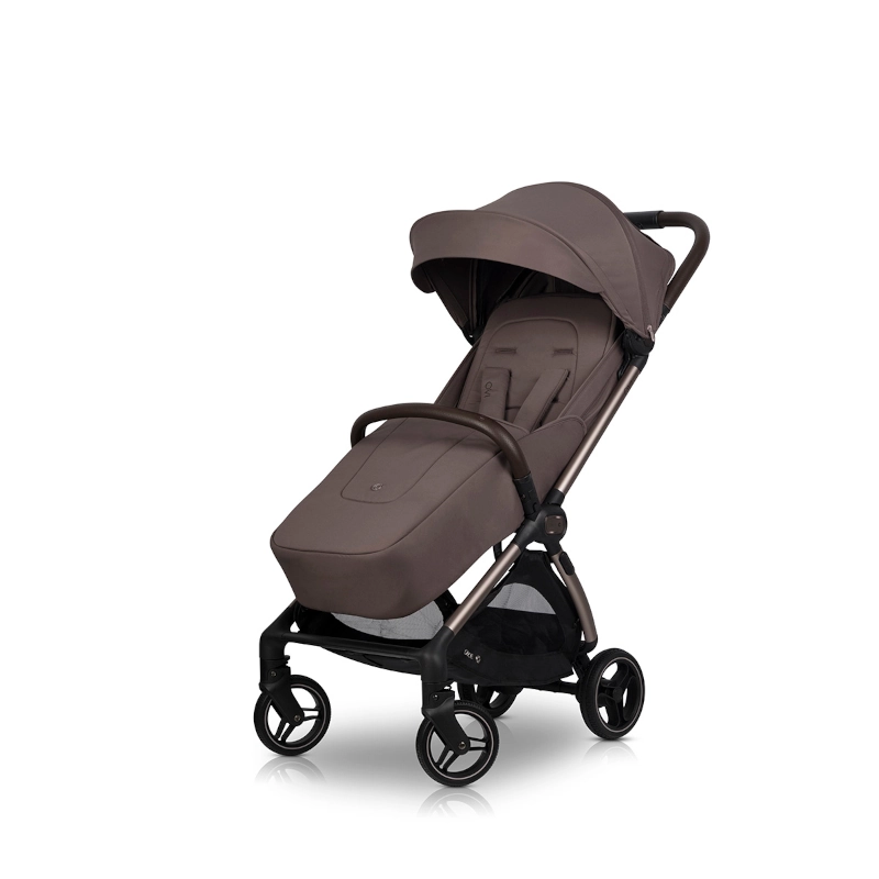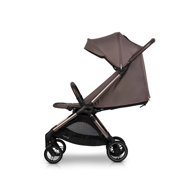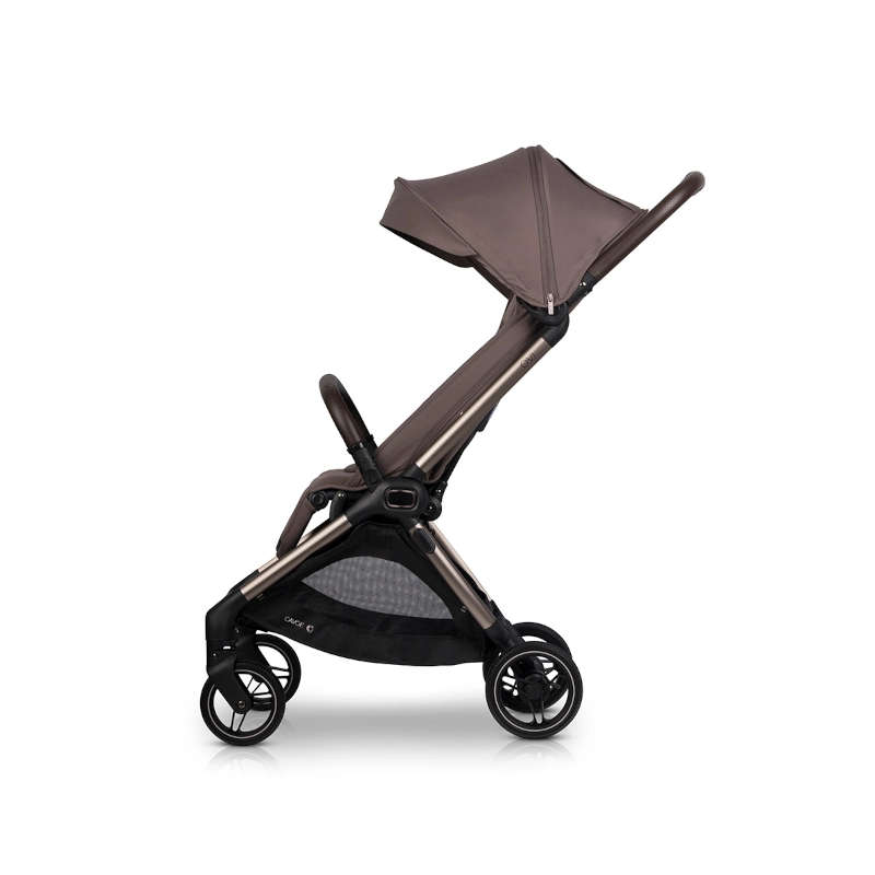 Η κατασκευή του ανήκει στην κατηγορία premium καροτσιών, με ανοδιωμένο μεταλλικό σκελετό σε κομψή καφέ-σαμπανιζέ απόχρωση, που προσφέρει αυξημένη αντοχή στις γρατζουνιές. Τα υφάσματα multispandex είναι υψηλής ποιότητας, μαλακά στην αφή και ελαστικά, αποτρέποντας το τσαλάκωμα.