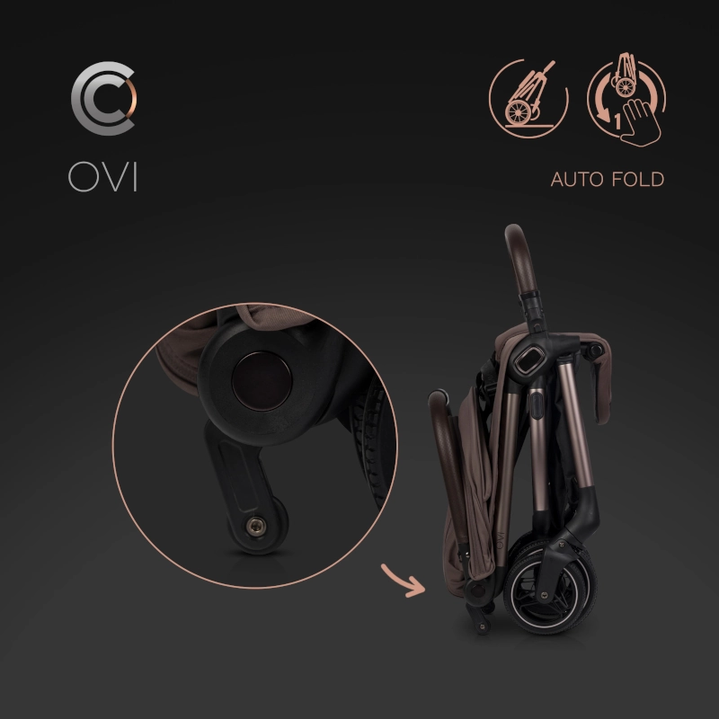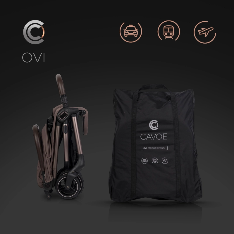 Χάρη στο σύστημα αυτόματου κλεισίματος, το Cavoe Ovi διπλώνει εύκολα με το ένα χέρι σε ένα συμπαγές μέγεθος. Αρκεί να ενεργοποιήσετε τον μηχανισμό και να σπρώξετε τη λαβή προς τα εμπρός, το καρότσι κλείνει αυτόματα σαν εκκρεμές. Όταν είναι διπλωμένο, στέκεται όρθιο και μπορεί να μεταφερθεί εύκολα είτε από τη μπάρα είτε σαν βαλίτσα, χάρη στα επιπλέον ροδάκια μεταφοράς.