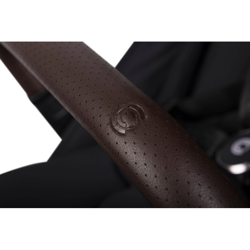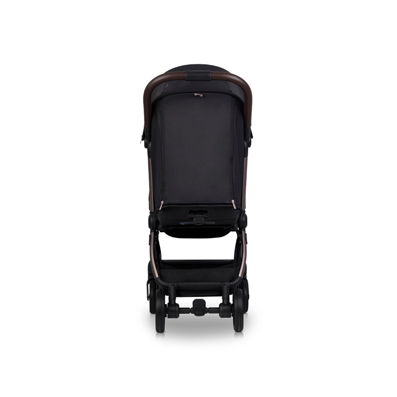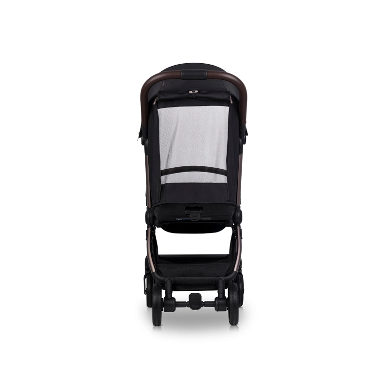 Η κατασκευή του ανήκει στην κατηγορία premium καροτσιών, με ανοδιωμένο μεταλλικό σκελετό σε κομψή καφέ-σαμπανιζέ απόχρωση, που προσφέρει αυξημένη αντοχή στις γρατζουνιές. Τα υφάσματα multispandex είναι υψηλής ποιότητας, μαλακά στην αφή και ελαστικά, αποτρέποντας το τσαλάκωμα.