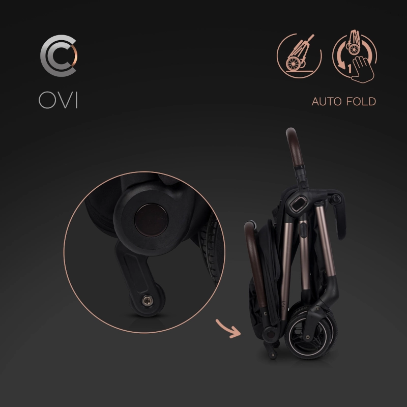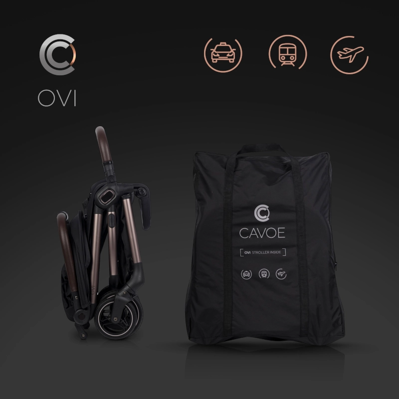 Χάρη στο σύστημα αυτόματου κλεισίματος, το Cavoe Ovi διπλώνει εύκολα με το ένα χέρι σε ένα συμπαγές μέγεθος. Αρκεί να ενεργοποιήσετε τον μηχανισμό και να σπρώξετε τη λαβή προς τα εμπρός, το καρότσι κλείνει αυτόματα σαν εκκρεμές. Όταν είναι διπλωμένο, στέκεται όρθιο και μπορεί να μεταφερθεί εύκολα είτε από τη μπάρα είτε σαν βαλίτσα, χάρη στα επιπλέον ροδάκια μεταφοράς.