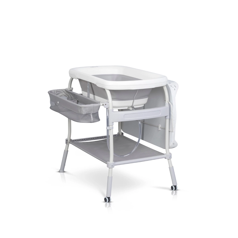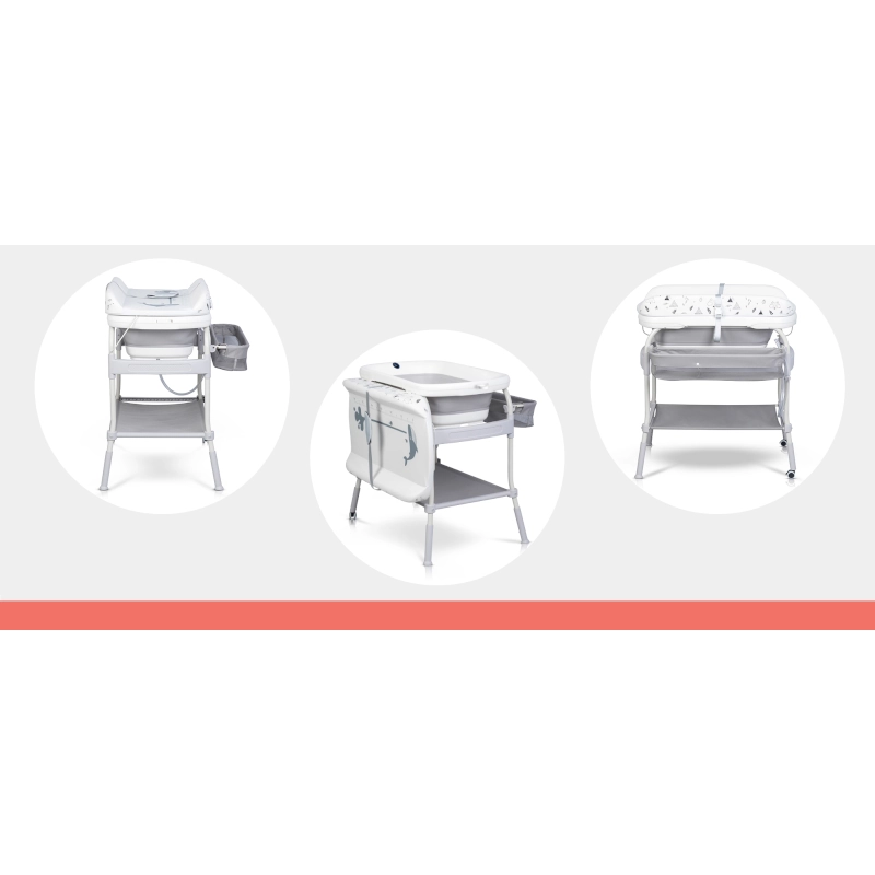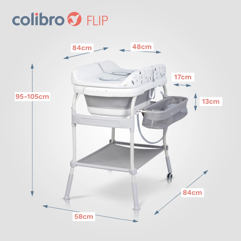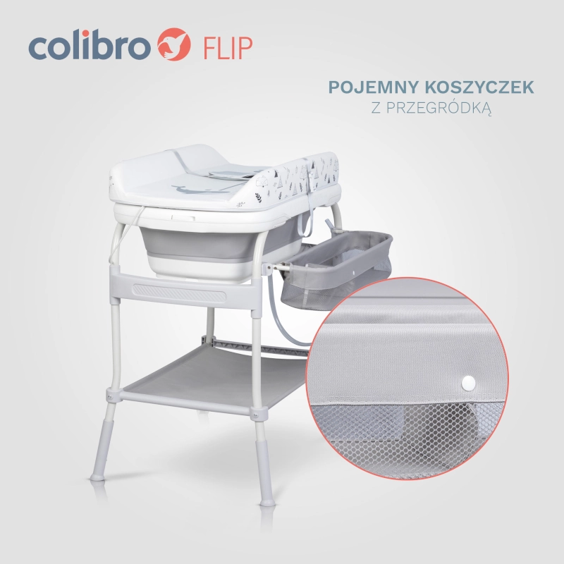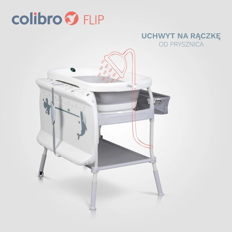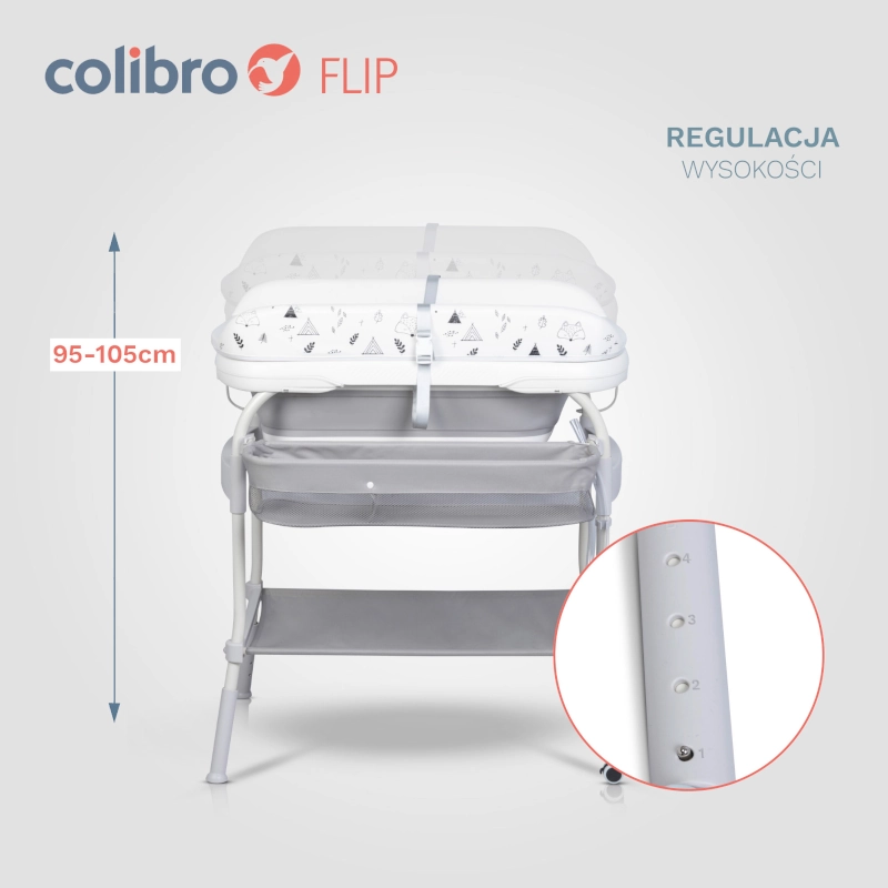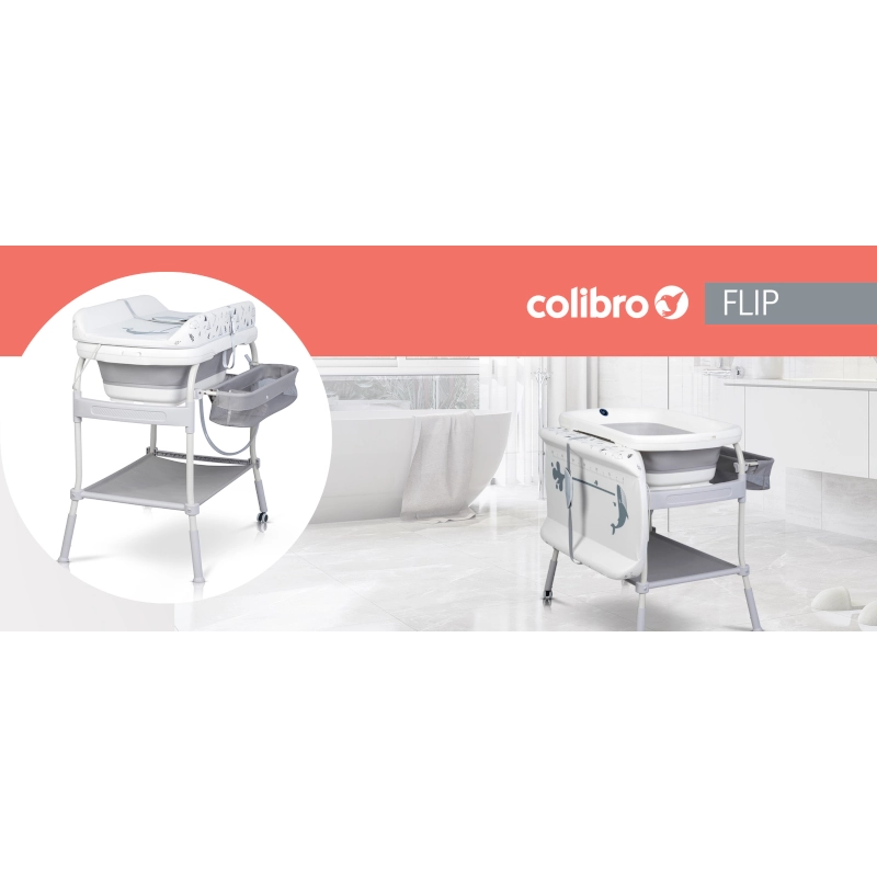 Το COLIBRO FLIP είναι ένα προϊόν 2 σε 1. Μπορεί να χρησιμοποιηθεί ως μπανιέρα μωρού ή ως πρακτική αλλαξιέρα (μπανιέρα αλλαξιέρα). Το FLIP διαθέτει ένα σταθερό, άνετο πλαίσιο με δύο ρόδες και δύο στοπ, καθιστώντας το εύκολο και ευχάριστο στην κίνηση. Οι ρόδες διαθέτουν φρένα, επομένως ανεξάρτητα από το αν χρησιμοποιείτε τη λειτουργία ως μπανιέρα μωρού ή αλλαξιέρας, μπορείτε να είστε σίγουροι ότι το προϊόν είναι σταθερό και ασφαλές. Στο κάτω μέρος υπάρχει ένα μεγάλο ράφι για αντικείμενα όπως μια πετσέτα, και στο πλάι υπάρχει ένας βολικός οργανωτής που θα χωράει όλα τα αξεσουάρ μπάνιου ή αυτά που είναι απαραίτητα για το αλλαγή του μωρού. Το COLIBRO FLIP διαθέτει ρύθμιση ύψους 4 σταδίων. Αυτή η λειτουργία είναι πολύ σημαντική για την ευκολία σας. Ρυθμίστε το ύψος που ταιριάζει στο ύψος σας.